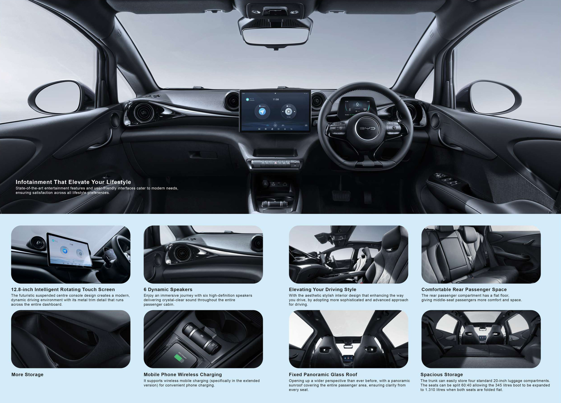 BYD DOLPHIN mengadopsi konsep desain baru 'Estetika Laut'. Garis bodi yang canggih, dipadukan dengan garis-garis tajam dan kontur yang mengalir, memproyeksikan desain yang percaya diri dan elegan yang ditopang oleh daya listrik bertenaga. Nikmati kebebasan dengan BYD DOLPHIN.